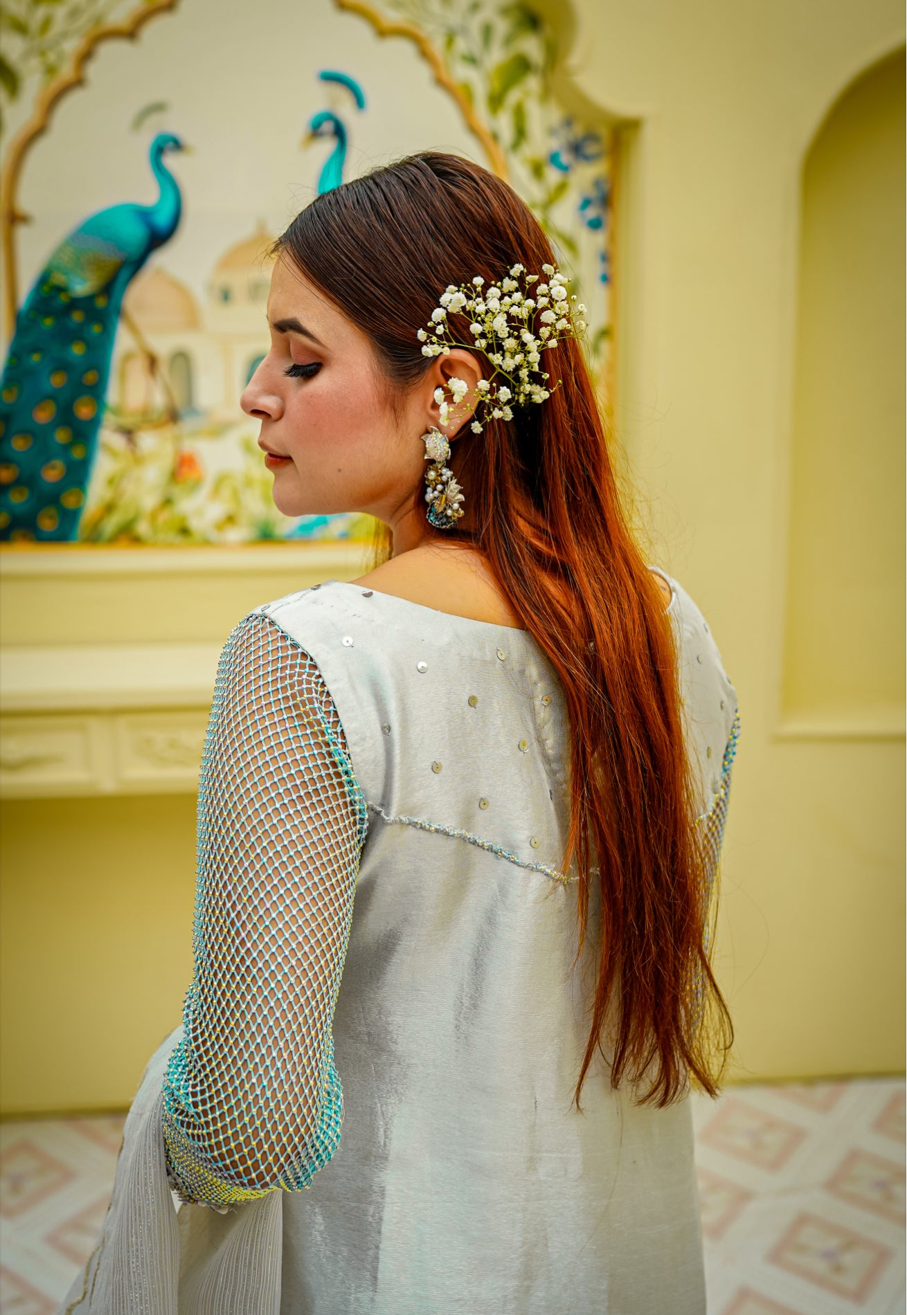 step into the world of elegence where tradition meets with modernity, Our latest collection "Shab-e-Mehtaab, This beautiful outfit radiates the charm of silver colour pallete with the artistic blend of accents of peach colour, and heavy detailing of 3D sequenced, stones and pearls handwork on a shimry pure tissue canvas and scalop duppta with sequins